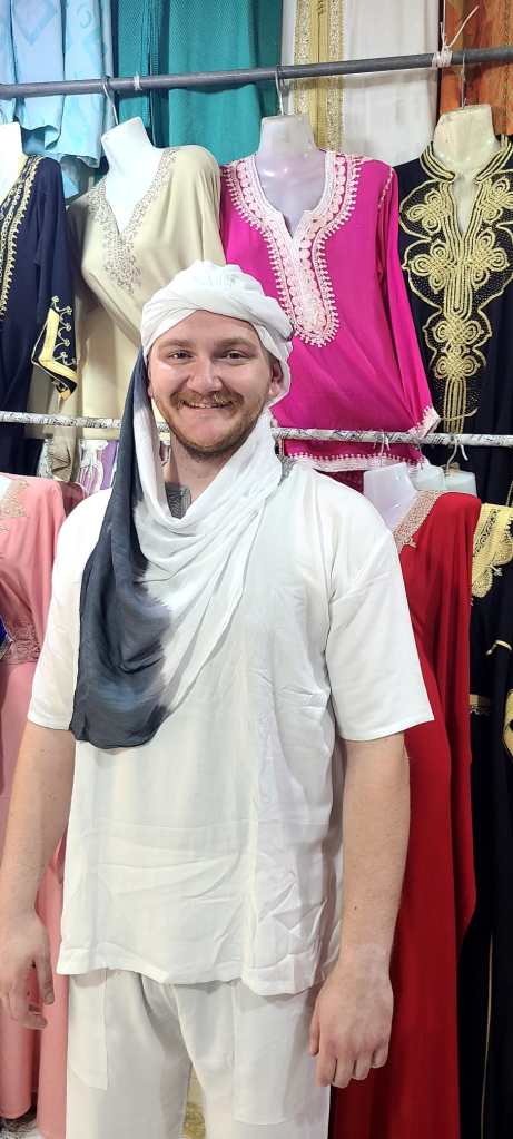 After that educational lunch Fatema and I continued exploring the city, and at one point we ended up stopping in a clothing shop as I had expressed my desire to stop in some shops and buy some stuff. Fatema lit up with excitement and we ended up going into one of the shops in the Medina close to where I had bought my jacket the night before. However this time I was left in awe at Fatema’s ability to haggle and talk back to the merchants. She was confident, steadfast and stern with the merchants, I had no idea what was being said as both of them would be speaking Arabic but she made it clear she wouldn’t back down from whatever they were saying, I had my eyes on a rustic leather satchel, and within a few minutes of back and forth she managed to get the merchant to sell it for virtually nothing under the guise that I was buying it for her, not for my own use. Locals always get the special treatment and discounts in places like this and Fatema had the courage to use that for my own advantage. Her ability to maintain this composure against a culture that did not take her seriously is so commendable and gave me a newfound respect for her and any woman growing up in this sort of atmosphere.