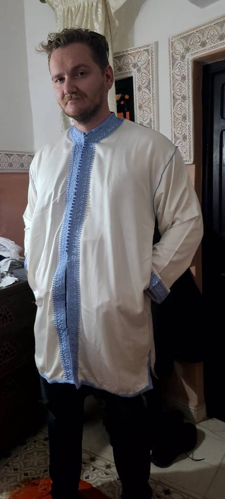 Afterwards we went into a different shop that sold “Traditional Moroccan Clothing” and things went a little off the rails. I had went in with the intention of just buying a shirt, something to add to my casual wardrobe, and through the coaxing of both Fatema and the merchant selling the clothes walked out of the shop wearing a full suit of Moroccan wedding clothes, and to be honest at first I felt pretty confident that I looked the part of an adventurer blending into the local customs and culture, but as I walked around the Medina with Fatema I began to feel a sense of insecurity wash over me. I wanted to tear the clothes off and retreat to my room in the Riad and I couldn’t figure out why. I got the clothes for an absolute bargain due to Fatema’s haggling, but I couldn’t help but shake a feeling of discomfort. Then it hit me, there wasn’t a single Moroccan dressed like this. As the day went on I began to observe the locals more and more and as we explored the Medina together I became more and more uncomfortable realizing the only idiots dressed in Moroccan clothing were the white tourists such as myself. On occasion a barker or merchant would be wearing some article of clothing that would be identified as “Berber” or “Moroccan” but they were always trying to sell the clothes. When I would stare at the locals walking the streets they were wearing western styled clothing, Nike, Adidas, sneakers and jeans. I felt so stupid and silly I told Fatema I was going to go back to my Riad to change into my street clothes again. She was very disappointed as I believe she found the clothes quite fitting to me, and was quite proud to be walking the streets with such a trophy as myself, buying her things, I remember the looks she was getting from other men in the medina for walking with me and I wasn’t sure if it was jealousy or disapproval. Probably a combination of both.