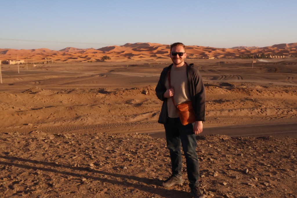 Marrakesh was nearly over. Today I would leave with a private guide to take me down into the Southeastern parts of Morocco to a camp in the Sahara Desert for two nights, then the guide would drive me north and drop me off in the city of Fez where I would stay for one night and then I would attempt to find my way from Fez to the mountainous “Blue City” known as Chefchouen, and then the port city of Tangier at the northern tip of Morocco, where the Strait of Gibraltar was located. I’d spend either one additional night in Tangier or in Chefchaouen depending on the vibes of the city, and then fly out of Tangier to Portugal to meet my friend John for a rave in the city in Lisbon.