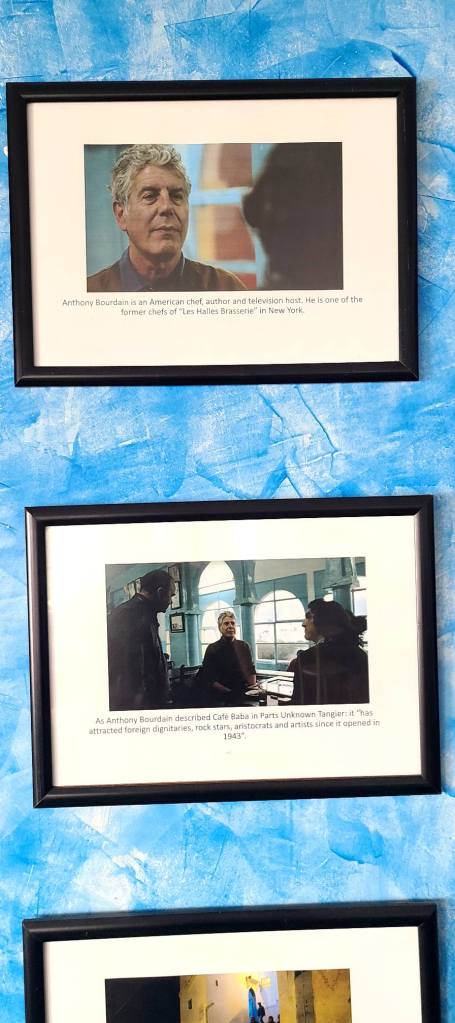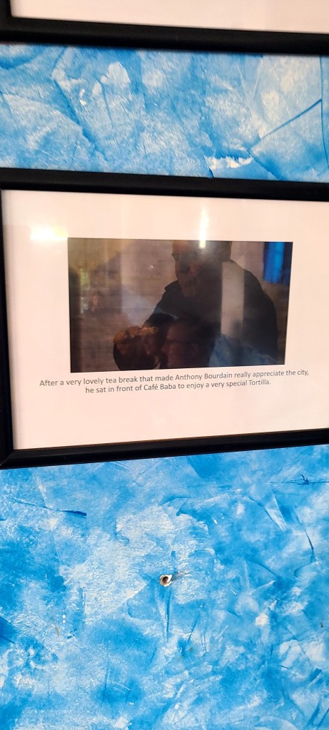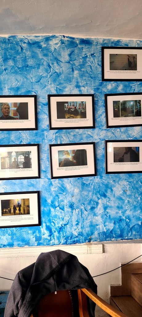 I realized there was a window seat on the left side of the cafe which overlooked the stairway below and made my way over and took in the customers who had been sitting before I walked in. I was one of two white people in the cafe. Everyone was smoking and drinking, laughing or watching the TV on the wall. Then I noticed something next to the TV, several picture frames all scattered across the wall, I couldn’t distinguish what they were but somehow I recognized them, I felt the urge to get up and investigate. As I got closer it became clear to me they were photos of Anthony Bourdain and the episode he had shot here in this very building.